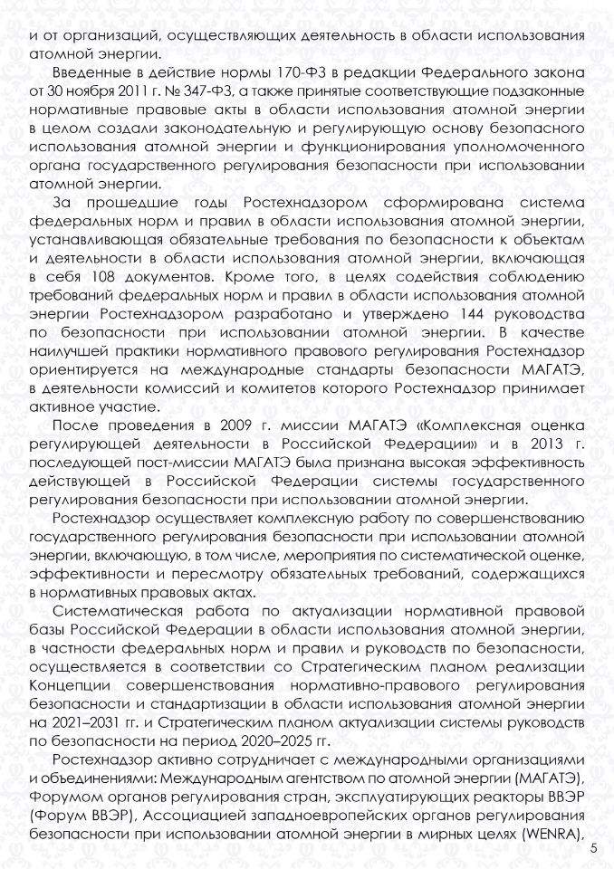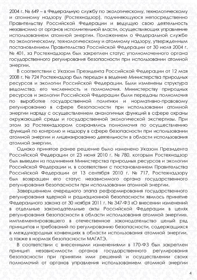 «Федеральные органы исполнительной власти, осуществляющие государственное регулирование ядерной и радиационной безопасности при использовании атомной энергии в мирных целях, должны иметь законодательно установленную независимость при принятии ими в соответствии с законодательством Российской Федерации регулирующих решений и действий, обладать надлежащими полномочиями и правами в отношении регулирования безопасности, позволяющими принимать решения регулирующего характера и применять санкции без давления, обусловленного интересами, которые противоречат целям безопасности, обеспечиваться достаточными кадровыми и финансовыми ресурсами для реализации своих полномочий и прав.»
